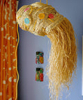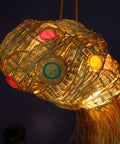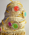 Light up your space with this one-of-a-kind swag lamp woven by Victoria Pater from reed, raffia and cicada wings preserved in colorful, repurposed play-doh tops.